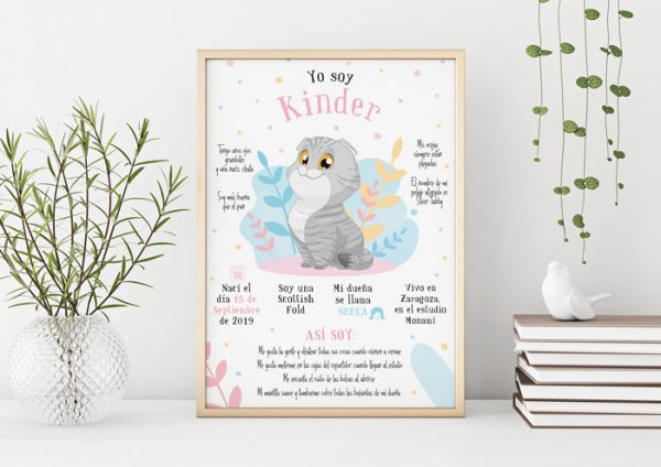 Podrás plasmar toda su personalidad en una decorativa lámina donde además de convertirse en un adorable dibujo, incluiremos quien son sus «papis», cuándo nació, sus juguetes favoritos o ¡su comida prefe! Cualquier cosa que se te ocurra y le haga especial.