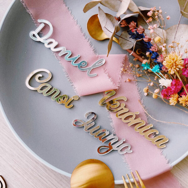 Sorprende a tus invitados con unos marcasitios personalizados con su nombre en metacrilato con efecto espejo. Tendrán un recuerdo único que llevarse a casa que además de decorativo es súper útil porque ¡lleva imán en el reverso y lo podrán colocar en la nevera!