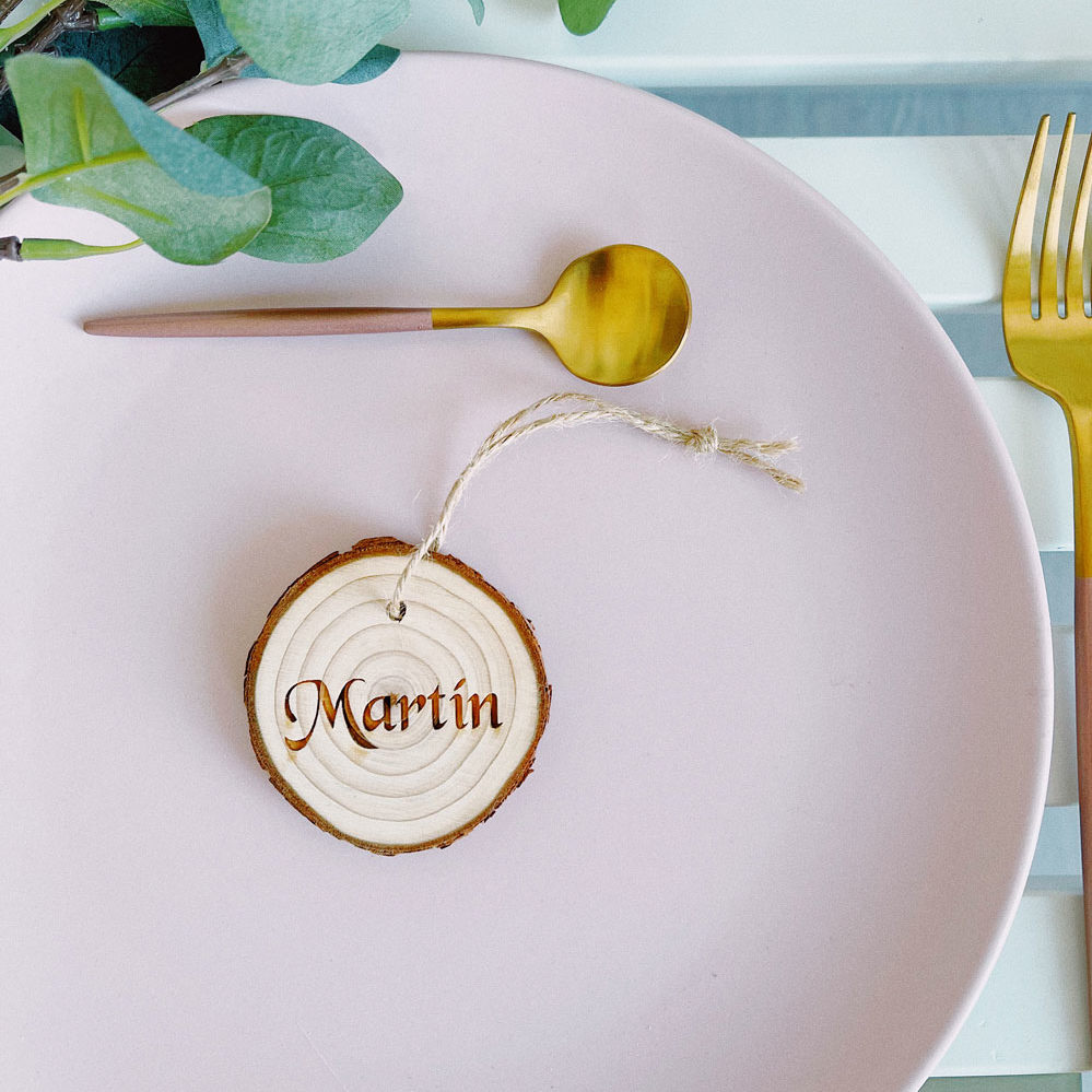 Las rodajas de madera natural grabadas son perfectas como marca sitios es un bonito recuerdo que el invitado puede llevarse y conservar ¡para siempre! El toque perfecto en tu celebración.